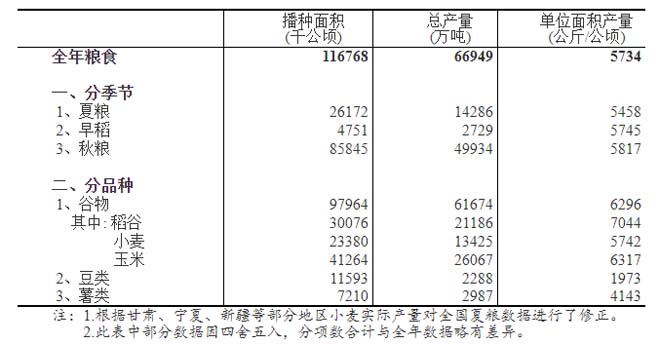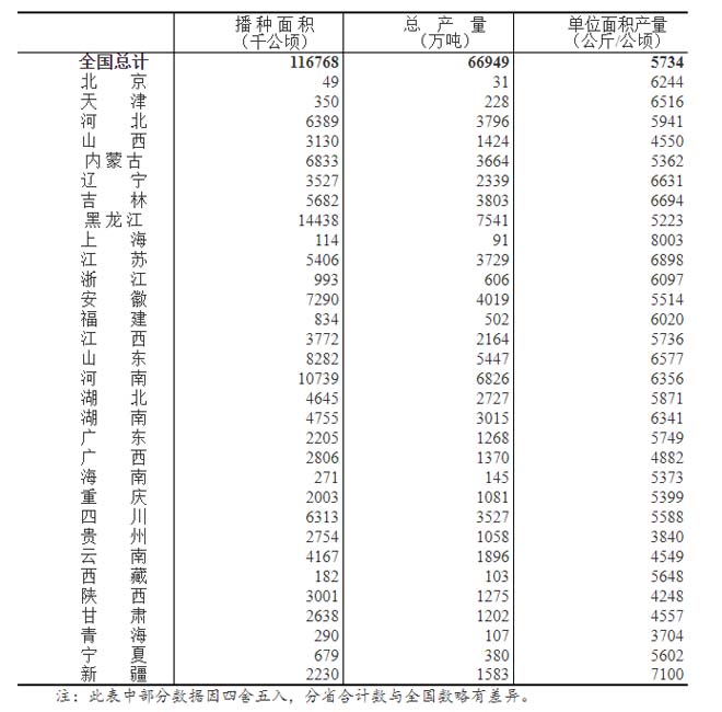 全國(guó)糧食總產(chǎn)量為31個(gè)?。▍^(qū)、市)夏糧、早稻和秋糧產(chǎn)量的總和。